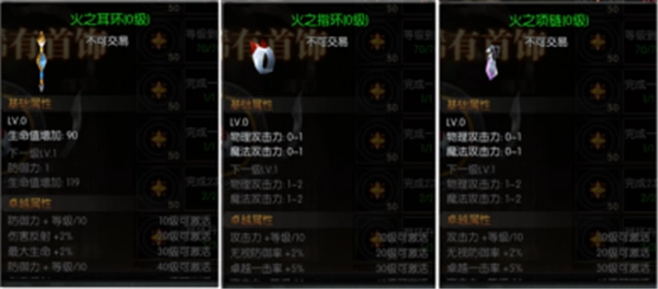 三种首饰因为部位不同,所以自带属性也各不相同。耳环为防御类型,属性为增加防御力及生命值;项链、指环为攻击类型,增加玩家的攻击力。并且由于项链只有一个,所以加的属性是要高于指环的。
