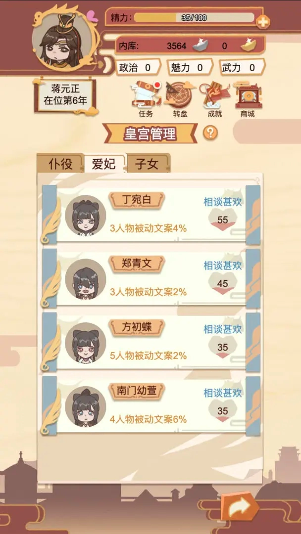 4、内库资金只能用于皇室的开销,玩家每年都可以进行选妃,选妃可以快速补充后宫人员,每次选妃都只能选择一位妃子;
