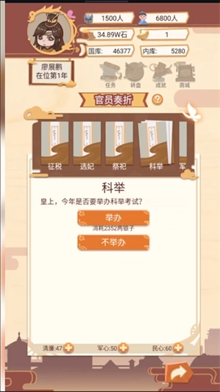 2、带年纪游戏中的官员奏折板块,处理官员,你的清廉会影响奏折中的开销还有收益,军心会影响军队的战斗力,民心会影响征兵效果,还有人口增长速度;
