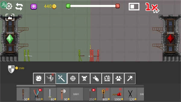-进入地图后,屏幕下方会出现一个道具栏,点击可以放置不同类型的角色和战术道具,让你的军队更具战斗力。准备好之后,点击屏幕上方的红绿剑图标,双方的战斗即刻展开。你将亲眼见证你的战术布置如何影响战局,享受热血沸腾的战斗场面。