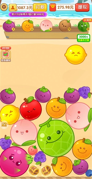这款名为《最爱大水果》的休闲小游戏,核心玩法是水果合成。玩家只需将两个相同的水果快速合并,就能解锁新的水果种类,还能获得专属福利。游戏还贴心设置了自动掉落功能,开启后水果会自动下落完成合成,无需手动操作。