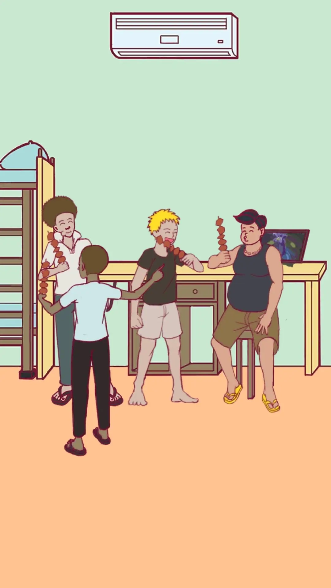 这是一款魔性十足的游戏,玩家在游戏里得利用场景中的所有物品去捉弄室友——不管是把熟睡的室友吵醒,还是在他准备入睡时点份烧烤诱惑他,各式各样搞笑的整蛊方式等着你来发挥聪明才智琢磨操作。游戏总共有26关,不过每一关都很短,玩家能尽情体验游戏内容。