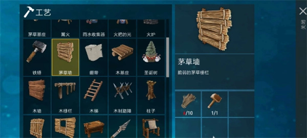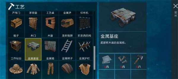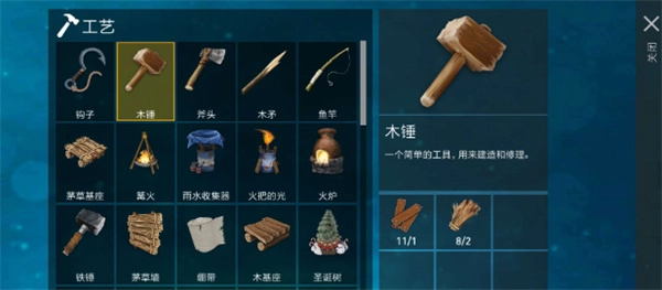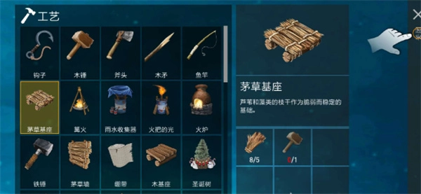 3、这个茅草基座,需要收集木锤和茅草,木锤只要1块木板和2份茅草就能制作出来,获得了木锤,这样就能直接制作出茅草基座,至于木基座和金属基座也是如此制作的。