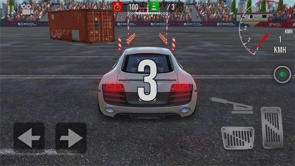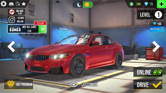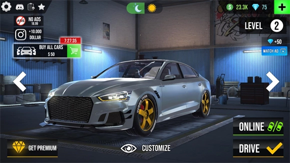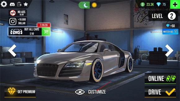 2、点击start后会进入车库,点击左右箭头可以切换车辆,点击右下角的drive可以开始比赛。