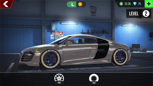 2、在改装界面你可以对汽车的轮胎、尾翼、传动、颜色、灯光、贴图进行修改。