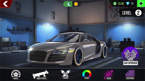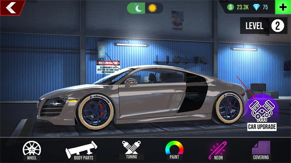 5、在改装界面点击car upgrade可以对车辆进行升级,可以升级的项目有引擎、轮胎、刹车、最高速度、悬挂,每次升级都会消耗金币。