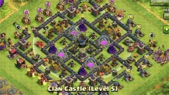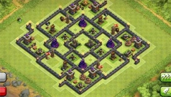 3、这个阵型还是可圈可点的,而且对于9本中期的玩家来说,这个阵型最大的优势就是保护黑水,金币和圣水,说实话不是太稀缺,但是黑水却和8本一样的稀缺,而且还有女王的存在,更是需要升级了,所以,这个阵型在9本中期还是非常有用的。城堡,分散金库,9本日常护资源。