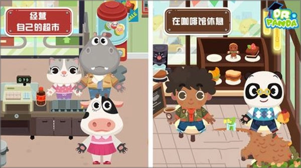 熊猫博士小镇游戏介绍而在超市场景中,孩子可以购买各类杂物、糖果,把想要买的蔬菜、牛奶放到自己的篮子中,然后再放到收银台去结账。为了体验真实的购买过程,孩子还可以在场景中的ATM机取钱用于购买,买完之后还可以和朋友在角落的咖啡店聊天。