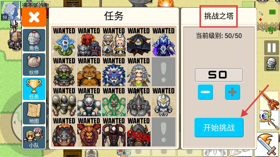 1、在挑战之塔界面,你可以调整想要挑战的层数,点击【开始挑战】按钮后,只要完成对应的任务就能获得丰厚奖励,这些奖励能帮助角色更好地成长。