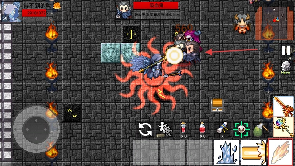 3、战斗中攻击【吸血鬼】,留意自身血量(2918/3725),释放技能持续输出,同时探索场景宝箱获资源。