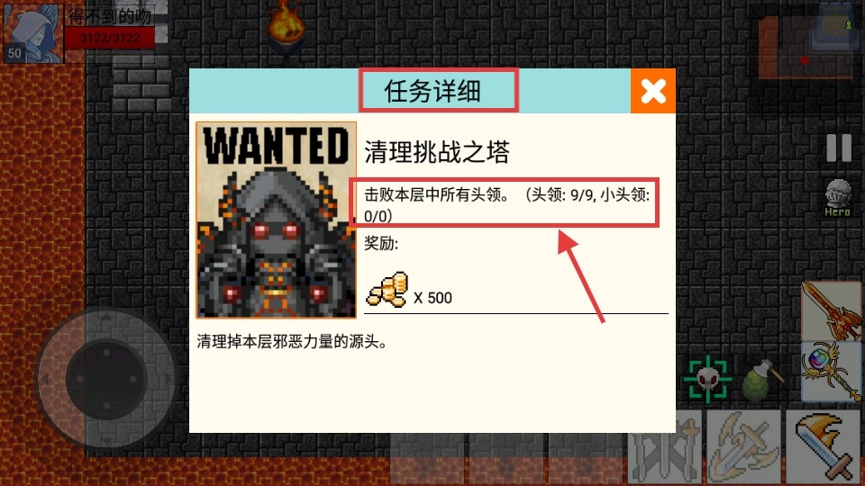 2、接取【清理挑战之塔】任务,需击败9个头领(小头领0/0),完成后获500金币,提升角色装备。