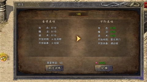 游戏中,当角色等级达到50级时,即可解锁转生任务。完成转生任务后,角色的转生等级将得到提升。随着转生等级的提高,角色能够穿戴更高等级的装备,解锁更多地图,并获得显著的属性加成。