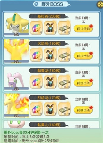 第三页为野外BOSS,需在特定时间内与BOSS交战,挑战成功可获得钻石、装备和宝可元。若失败,BOSS会逃跑,每次挑战需消耗挑战证明书。