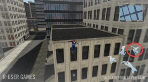 3、长按两下如图所示位置便可以吐出蛛丝,飞向附近的建筑物内。