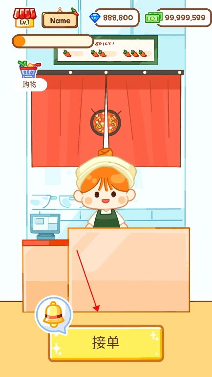 1、本次安装《麻辣烫大师》游戏后,首次进入游戏的玩家,请点击“购物”按钮。