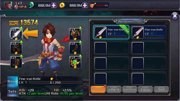 盔甲的获取方式也类似,在击败BOSS后开宝箱或者去商店购买都能得到。上面那张图里,左边展示的是武器,右边则是盔甲,下方那些银色石头的图标就是用来升级装备的锻冶石,按照从左到右的顺序,它们的等级依次是LV1到LV5。升级的机制很简单,不同等级的锻冶石敲击武器的次数各不相同,武器最终获得的加成数值,就由敲击次数的多少来决定。这些石头的敲击次数是从左到右逐渐增加的,最左边的石头每次使用会敲击4下,最右边的石头则会敲击8下。
