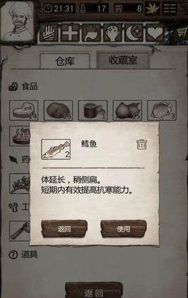 2、冬天怎么过:从31-61天都属于冬天,尤其在50-55天左右温度非常低,最好在探索完前期的几个资源点以后,就开始累积资源。将火堆和帐篷升满级,准备大量的草药,淡水和木头就能过,如果有抗寒的鱼或者藤甲就更轻松了。