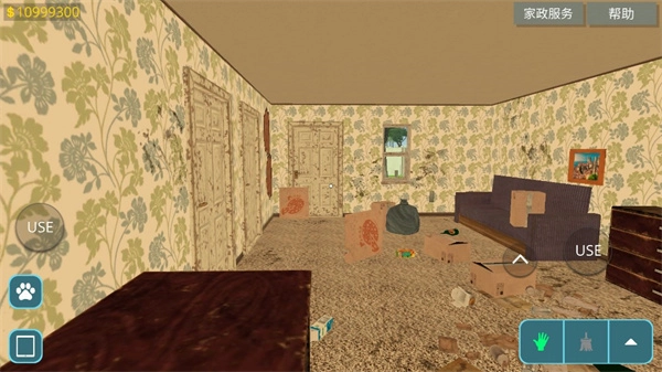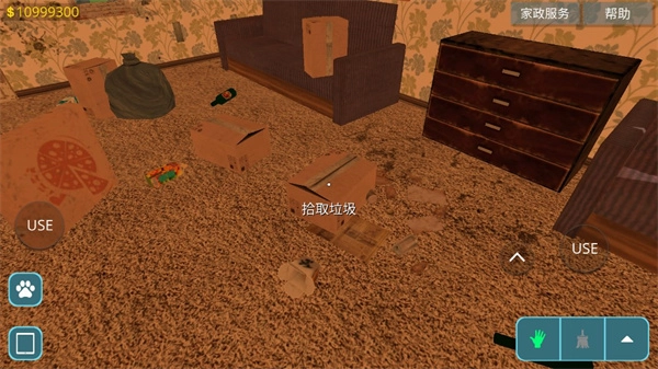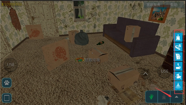 2、成功进入房间,点击右下角的这个图标可以使用道具来打扫垃圾;