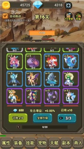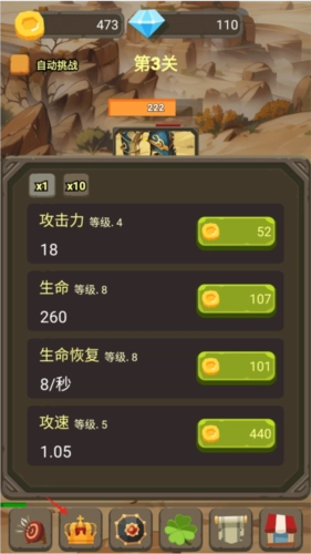 轻松的放置玩法与成长体系结合:放置玩法让玩家可以在忙碌之余轻松享受游戏的乐趣,不需要花费大量的时间和精力去操作。同时,游戏中的成长体系又让玩家能够感受到角色不断变强的过程,通过每一场战斗赚取金币,提升和强化自己的能力,这种轻松与成长的结合使得游戏既不会过于枯燥,也不会让玩家感到过于疲惫,保持了良好的游戏节奏。