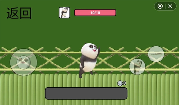 6、可以看到左下角可以控制主角国宝熊猫进行移动,顶部是当前角色的血量,右侧分别是跳跃和武器,由于小编刚开始玩,还没有获得金币,没钱购买武器,所以暂时不能使用。 7、开始向右移动,碰到飞机提示,遇到大的坑需要跳跃+前进,才可以通过,小心不要掉落水里。