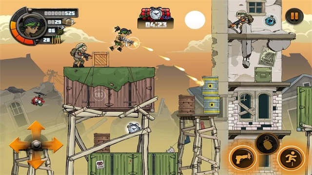 2、进入游戏关卡,通过移动角色,跳跃和攻击,使用不同的枪和手榴弹可以快速的消灭敌人