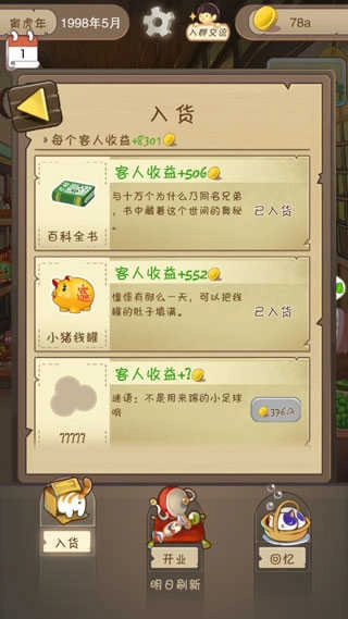 这里是你的主战场。通过采购并上架各类怀旧商品赚取收益。每件商品都有初始成本,但一旦上架便无需补货,只需轻点前来光顾的顾客,即可获得收入。
