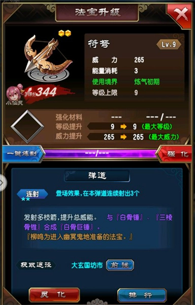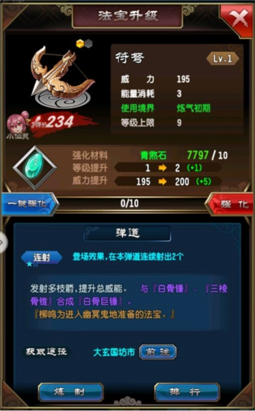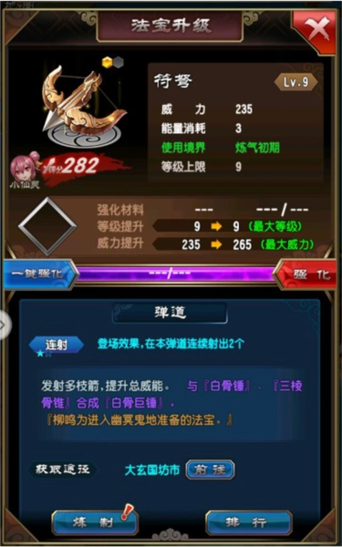 1、升级与炼制的操作步骤:打开行囊,从中挑选出需要进行炼制的法宝