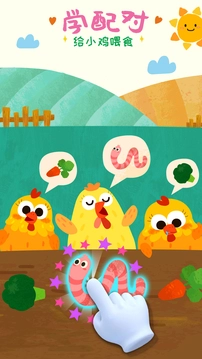 动物农场里的小鸡饿了,你能找出小鸡喜欢的美食喂给它吗?接下来去清理羊毛吧,拿起动物洗澡刷,把绵羊刷干净。帮奶牛赶牛蝇,喂它吃牧草。击退胡蜂,保护蜜蜂!宝宝们,你的农场动物能不能健康成长呢?就看你的咯!(学习配对,锻炼手眼协调能力)