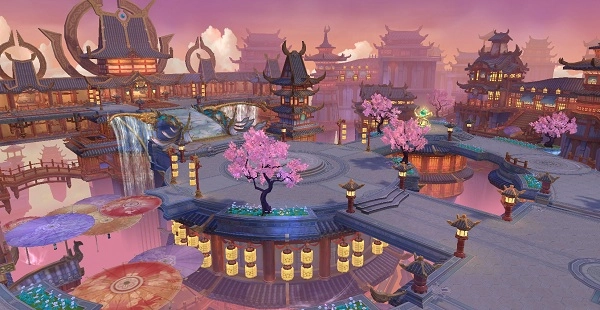 设计思路:最为展现万妖之国奇幻而绚丽的一面,如血樱般的永夜下,辉月垂挂东宫。而主角出生点的月影轮台有仙鹤衔星而来,层层竹影下画卷铺设的道路,显国风精粹;作为狐族一脉发迹之地,也是万妖之国一众修行者最为向往的灵气聚集地。山中设有圣贤台,狐岐山各代妖主在此授业讲课。台席下蜿蜒流淌的墨池莲花摇曳,溪水涟涟。山中灵气贯通汇成星桥,站在桥的顶端可一览山中全貌。后山的桃花林层层叠嶂、雾气氤氲,巨兽嘶吼伴随铁链咂咂作响,掩映后山一处神阵的蹊跷传说——修炼得道的妖,能从此阵传送至无双城;