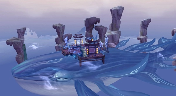 设计思路:悬浮于幻鲲背部,遨游天际的传说之境,乘月而升,伴日而息,无人知晓其方位,更没有人知晓古城中有何物。核心战斗区域为平地区域,如碧玉雕琢,嵌于鲲背,附有特色装饰,自成一体的同时也能让玩家感受到身处神鲲背部。