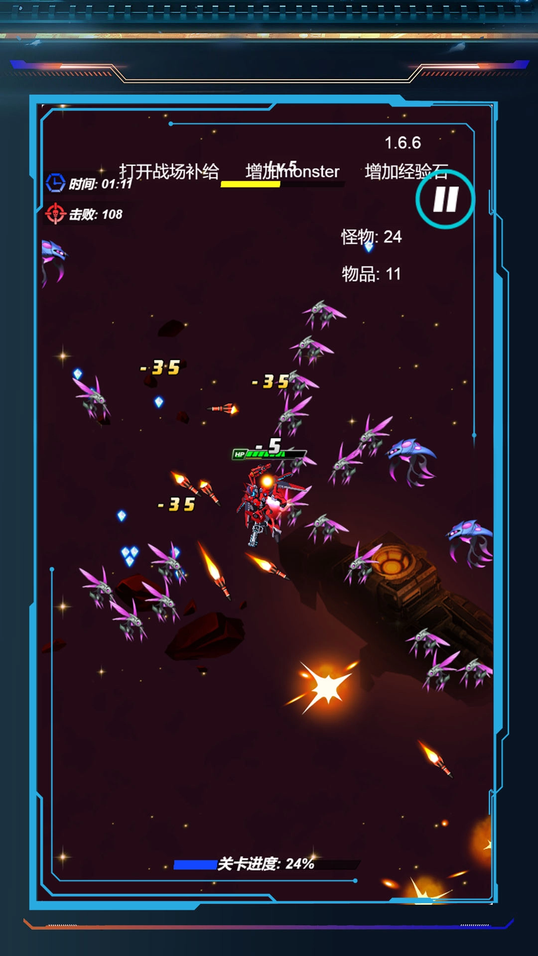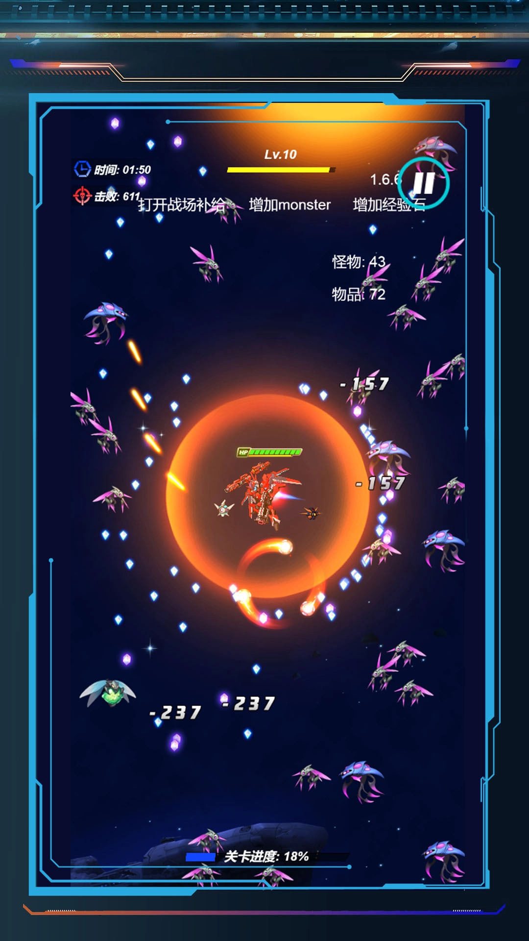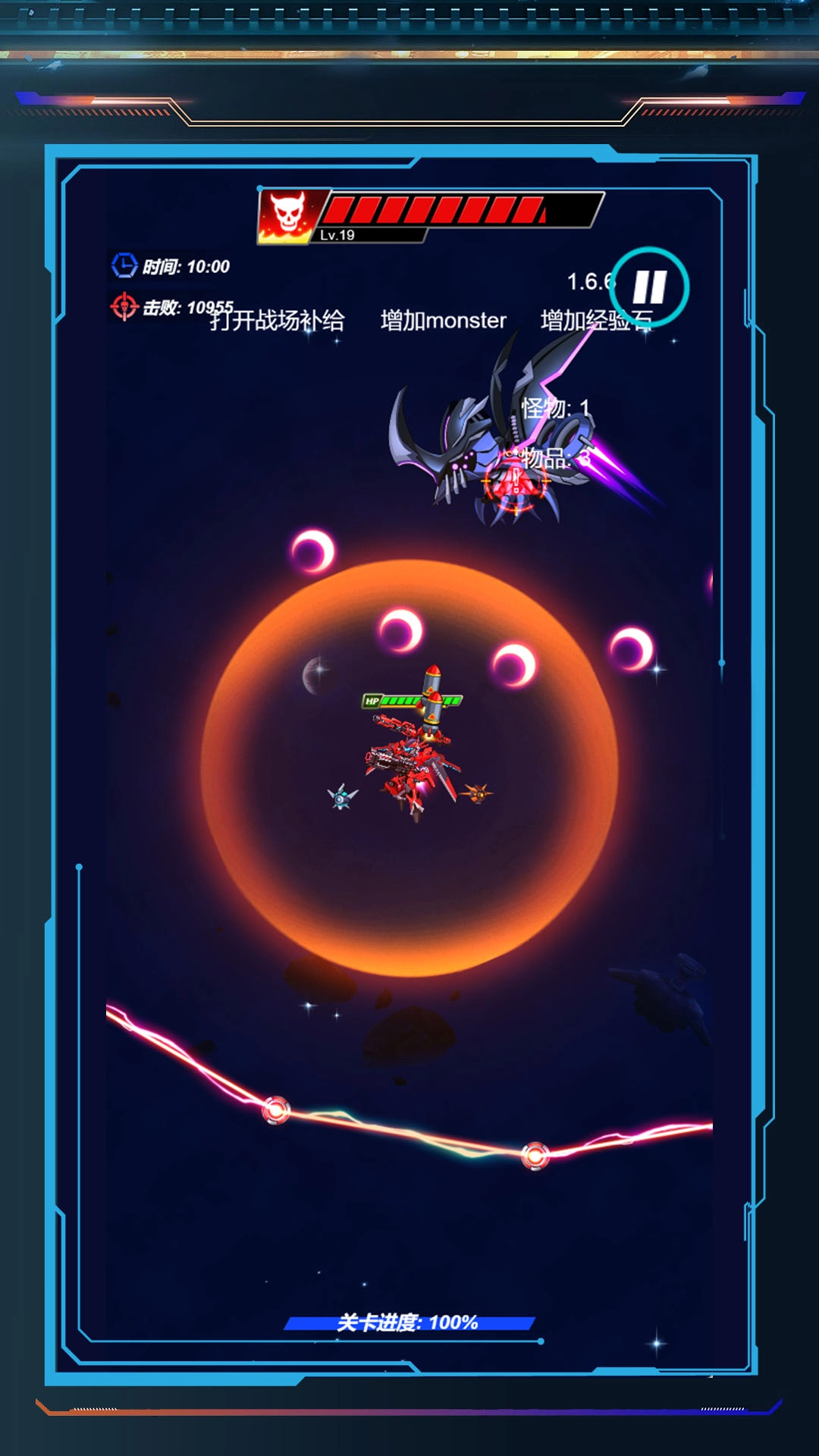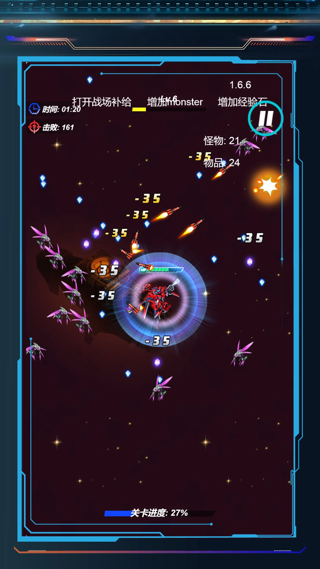 2、捡场景道具、经验石,升级机甲武器、护甲,提升战力,应对更强怪物。