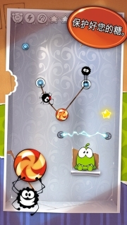 ◆在游戏里,玩家需要剪断绳索,使得糖果既能击破周围的星星,又能落入Om Nom的口中。