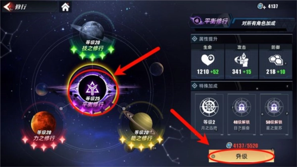 在修行系统中,需要先修行平衡修行,点击平衡修行再消耗探索点升级