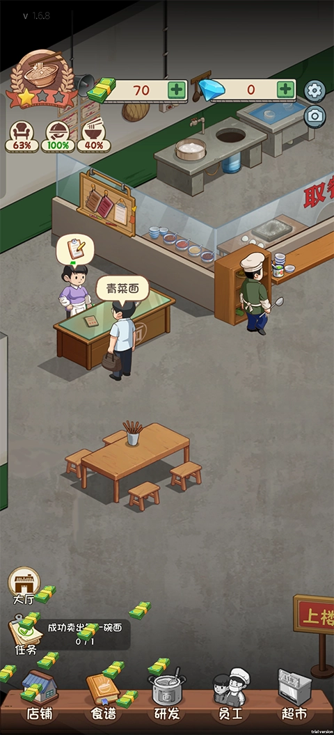 3、店铺经营:接待顾客、制作面条、结账收银,完成日常任务赚收益。反复制作提升熟练度,可一键快速出餐。自由装修店铺,升级设备扩大规模。