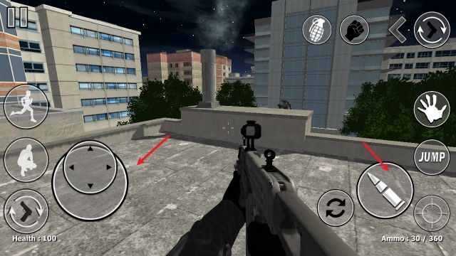 1、在左侧屏幕区域拖动手指,就能控制角色移动;点击右侧的子弹图标,即可触发射击操作。