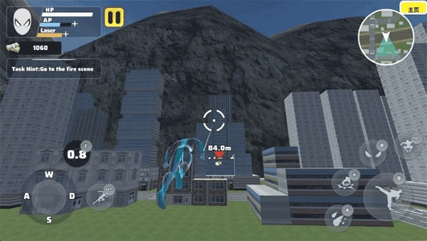 3、左侧虚拟摇杆负责角色移动方向,旁边的按钮可发射绳索并触发加速滑行,灵活运用能让你在城市间高速穿行,大幅提升机动效率。