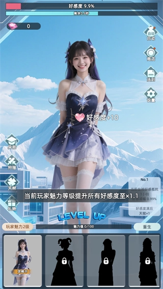 5、攻略成功后你就能开始攻略下一位女神【玩法就是送礼物刷好感度攻略女神,前期点点屏幕(点赞),升级很快,点一点异能天赋后自动刷礼物就解放双手纯挂机了】