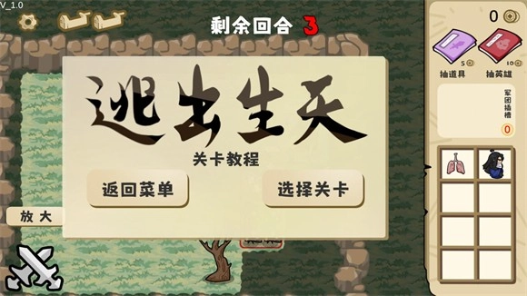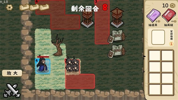 3、正式开始后,角色左上角的数字代表本回合可以行动的次数,游戏的右上角可以抽取道具和英雄,下方的方块是物品栏。