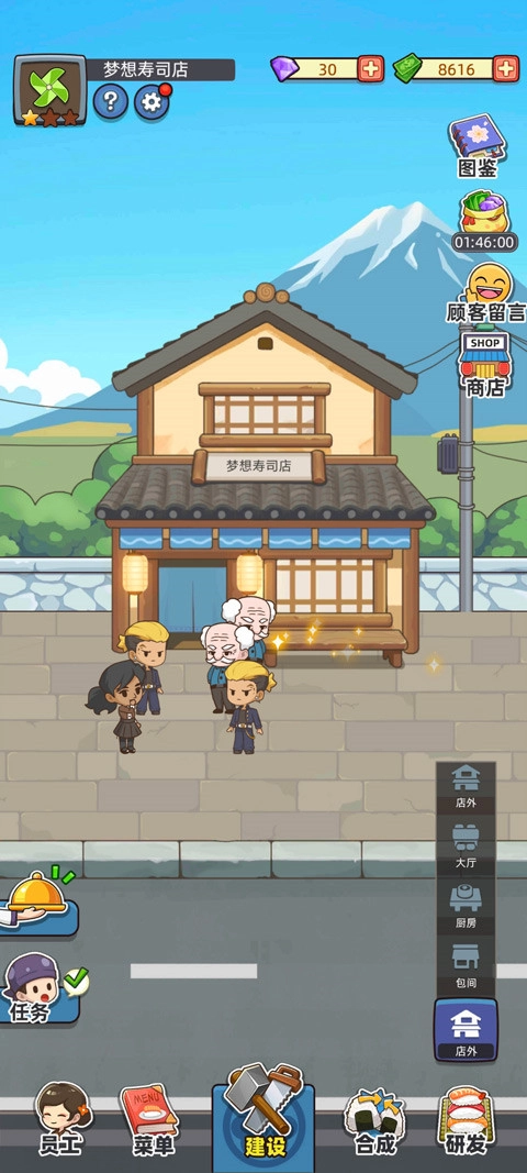 其次,梦想寿司店在玩法方面还主打模拟、经营、招募、制作等多种元素一体,因此小伙伴不但可扮演成寿司店老板的角色与员工小野凉一起共同经营,并在游戏中完成开发各种日料菜品,制定日常采购计划,服务顾客,培训厨师和服务员,购买餐厅用品,开连锁店等一系列的操作,制作出不同的食物来满足顾客的一切需求,赚取更多的资金收益,解锁更多的食材资源,为你的每一位顾客带来幸福感,从而打造属于你的高人气寿司店铺。