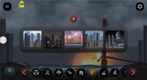 1、打开游戏,可以看到底栏有多种灾害手段,像是龙卷风、核弹、飞碟、地震等等,可以任意选择一种灾害来破坏城市,非常的过瘾