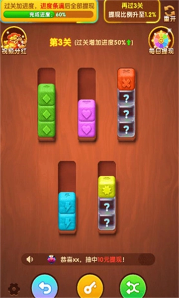 发财金块是一款闯关类休闲小游戏,玩家通过完成关卡推进游戏进度,既能用来打发时间,又能借助观看视频获得分红以提升每日提现额度。每通过一关都能领取相应奖励,可选择部分领取或全额领取;当游戏进度达到100%时,即可发起提现。若关卡挑战失败,还能返回上一步重新尝试。