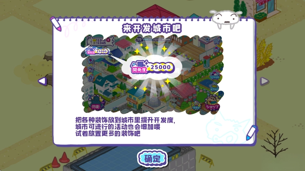 《蜡笔小新春日部市大开发》是一款洋溢着欢乐与温馨氛围的城市模拟建筑管理类游戏。在这里,你将化身城市规划师,和野原一家还有春日部防卫队的小伙伴们携手并肩,从一片空白起步,把原本普通的春日部市打造为一座满载梦想、奇迹,还处处有动感超人身影的超级都市!