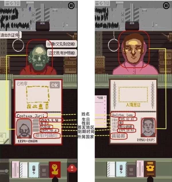5、当玩家拿到一张证件后,最容易检查的地方是相貌、有效期等一眼明朗的区域,而拗口的签发地区和所属地区却成了最麻烦又最卡时间的难题,虽然普通玩家可以通过滑动最下方的工具栏来切换“记事本”与“证件桌面”的显示,但每个人都需要这么一套流程的话还是很麻烦。