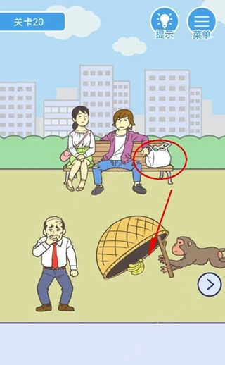 20、温泉物语:点击青年包中的香蕉放入陷阱引出猴子,将其带至第二场景投入温泉,主角趁机入浴完成放松任务;