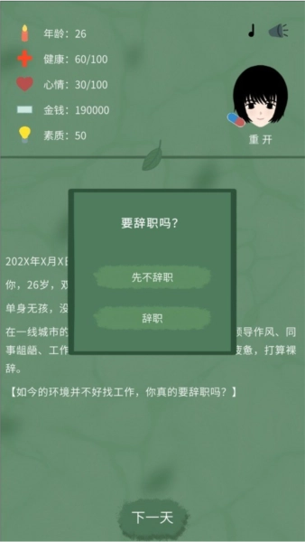 1、每个决定都会影响未来发展,玩家可以自由选择人生方向,体验不同的结局,感受裸辞后的真实挑战。