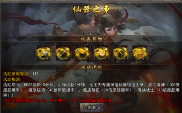这是一处大战遗址,此地的怪物搜集了不少知名仙器的碎片材料。玩家通过击杀这些怪物,就能获取仙器碎片,进而激活仙器,让仙器加身,获得更强大的力量。