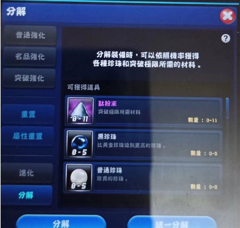 然而我必须说,在突破强化开放後,如此的数值可能新人期还勉强堪用,但对於高阶玩家来说,实已不敷对付全新的环境了,因此进行突破强化有其绝对之必要,突破强化从强化+10的「大鱼加成/OO大鱼奖励」为基础值,每往上突破一级,能力增加0.2%。我建议只要是用来拚大鱼的装备,最低至少也要突破强化至+13以上,可以的话要+15以上。