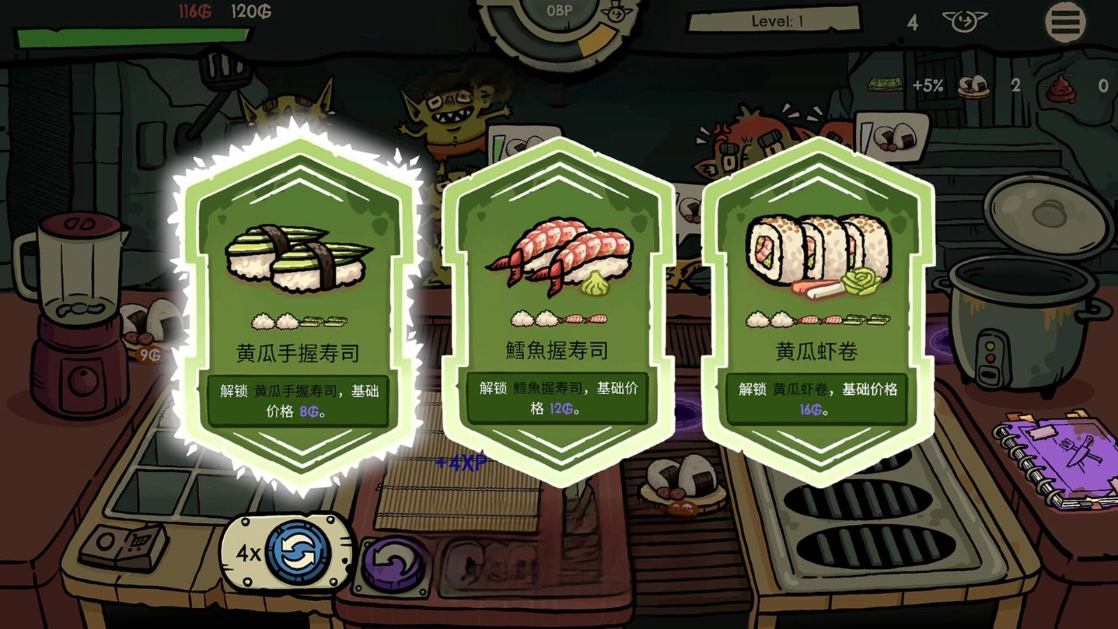 3.从基础握寿司起步,逐步研发刺身拼盘、军舰卷等进阶菜品,每道新料理均需满足特定条件后开放。