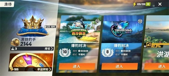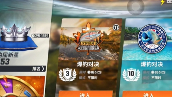 3、锦标赛:锦标赛同一时间可以参加两场,每一场时间持续四个小时,进入锦标赛进行钓鱼即可获得分数,按当前渔场钓鱼得到的分数进行排名,锦标赛时间到后会结算奖励,两个竞标赛有两个小时的时差。