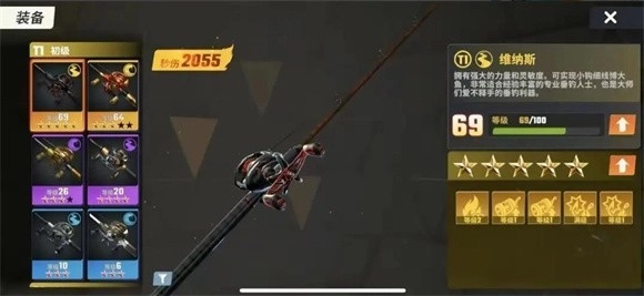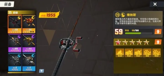 2、鱼竿:鱼竿与渔场一样,一共也是四个等级,分别是T1,T2,T3,T4,每个等级的鱼竿只能在对应等级的渔场钓鱼,鱼竿通过打开金色宝箱获取,重复获取的同一鱼竿会变成碎片,用于对鱼竿升星,升星可以解锁鱼竿技能,带来更高的钓鱼伤害。钓鱼主要使用金色鱼竿,升级到69级左右即可钓上这一级别的所有鱼包括典藏,鱼竿升级消耗金币与碳布,碳布主要来源是通过打开宝箱与转盘获取。鱼竿升级后无法重置消耗的金币与碳布,金币在20级左右就会开始溢出,主要稀缺的是碳布,所以不要升级金色以下的鱼竿,前期可以用送的光轮3000过渡。